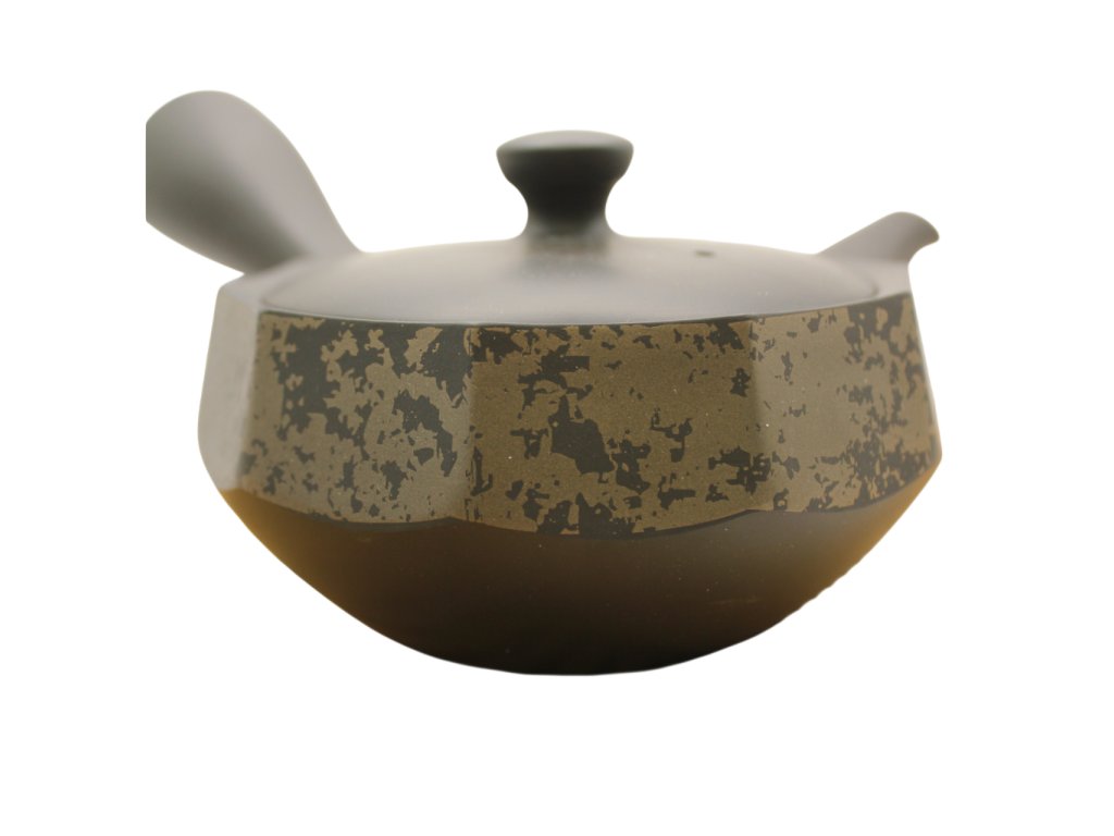 Elegantní tmavá čajová konvička se zlatou glazurou přináší luxusní vzhled a výrazný design. Zlaté odstíny glazury vytváří krásný kontrast s tmavým povrchem.