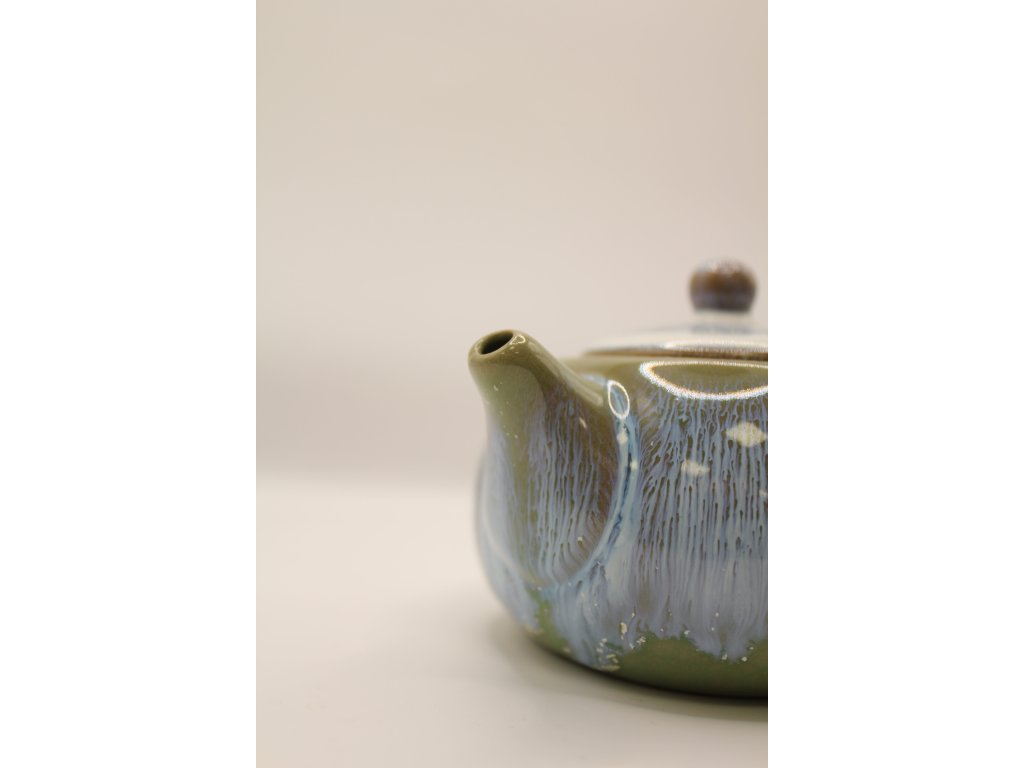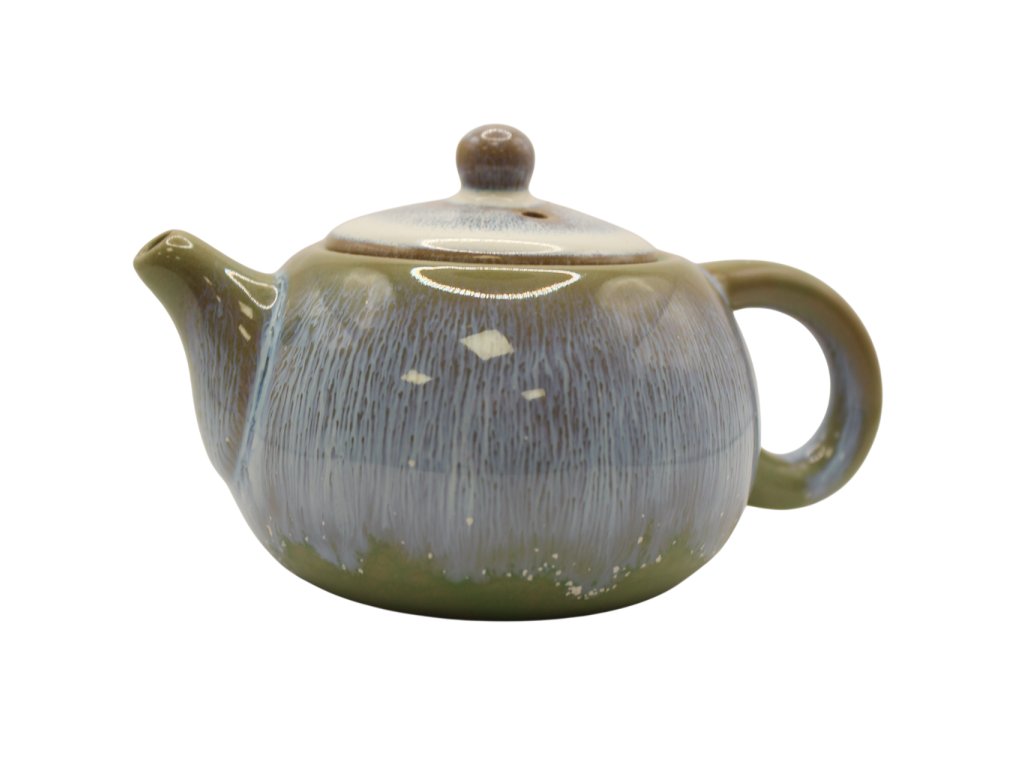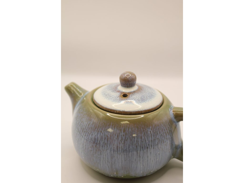 Malá čajová konvička se zelenomodrou glazurou přináší barvy inspirované přírodou. Kombinace zelených a modrých tónů vytváří harmonický a uklidňující vzhled.